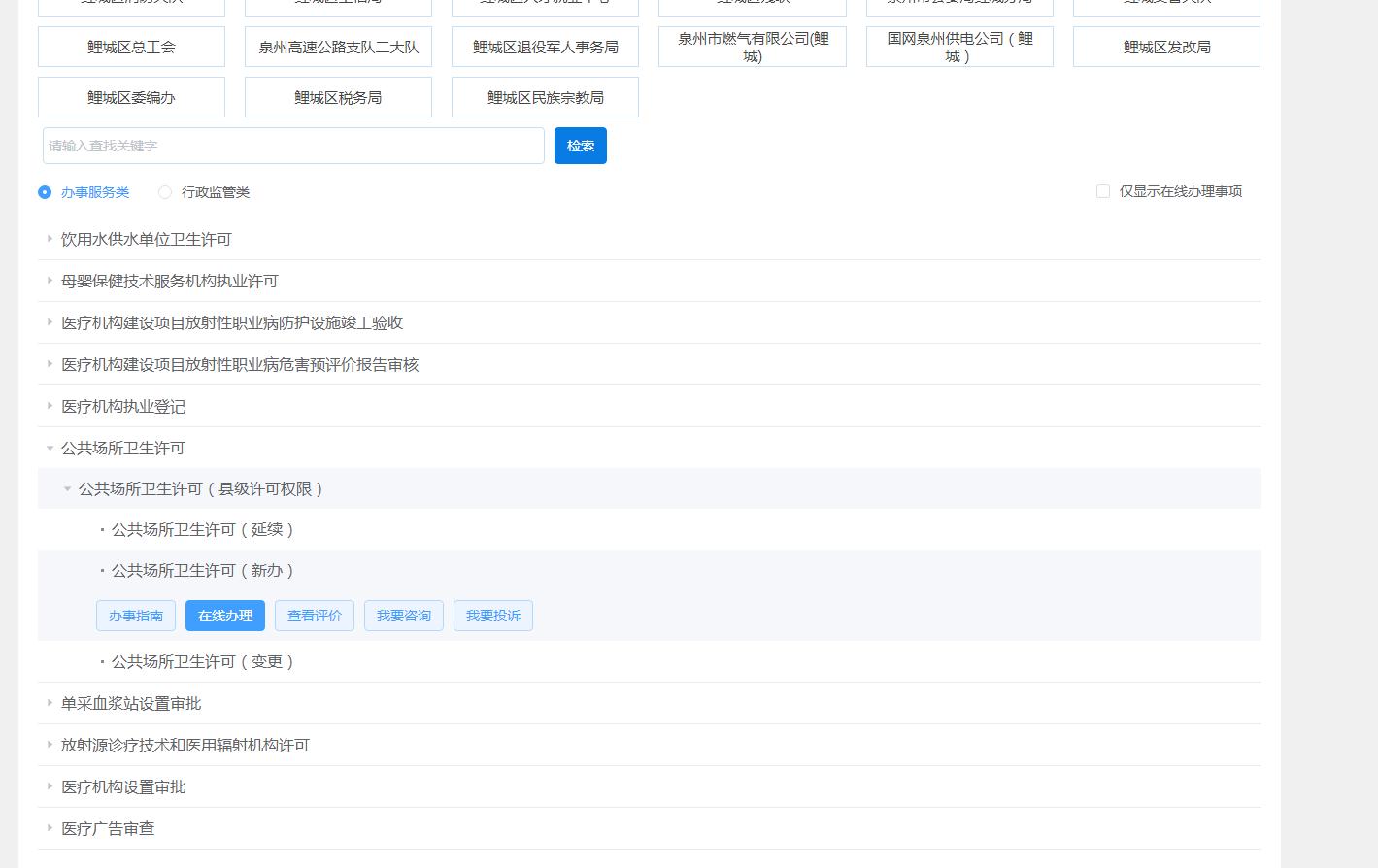 2、線上申報:登陸https://zwfw.fujian.gov.cn/選擇“鯉城區”,按“我要辦”-“部門服務”-“鯉城區衛健局”步驟查詢需辦理事項,點擊“我要申報”。